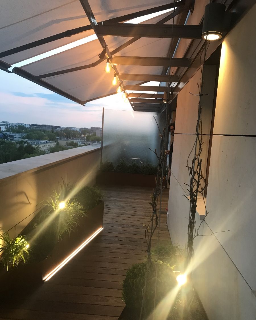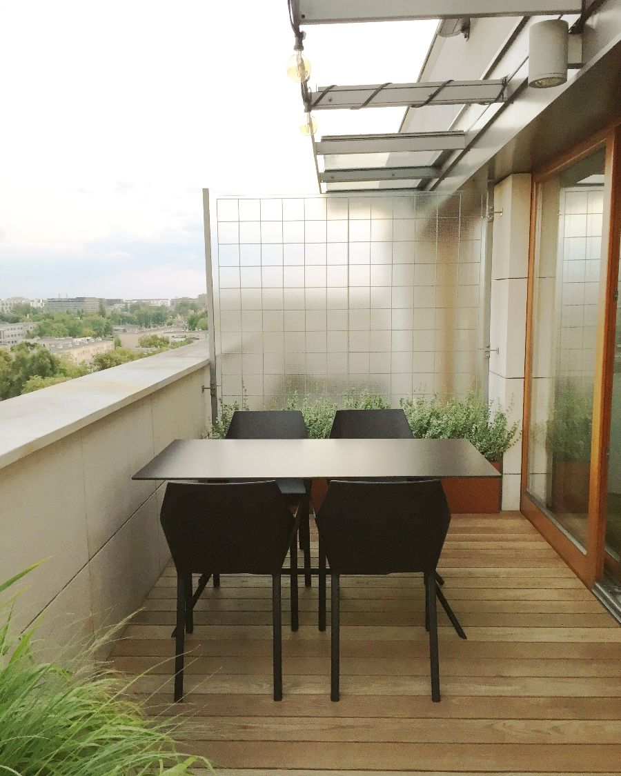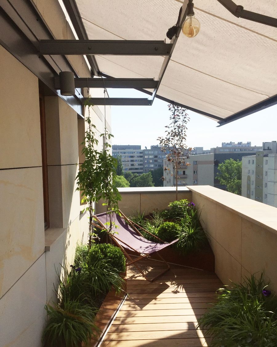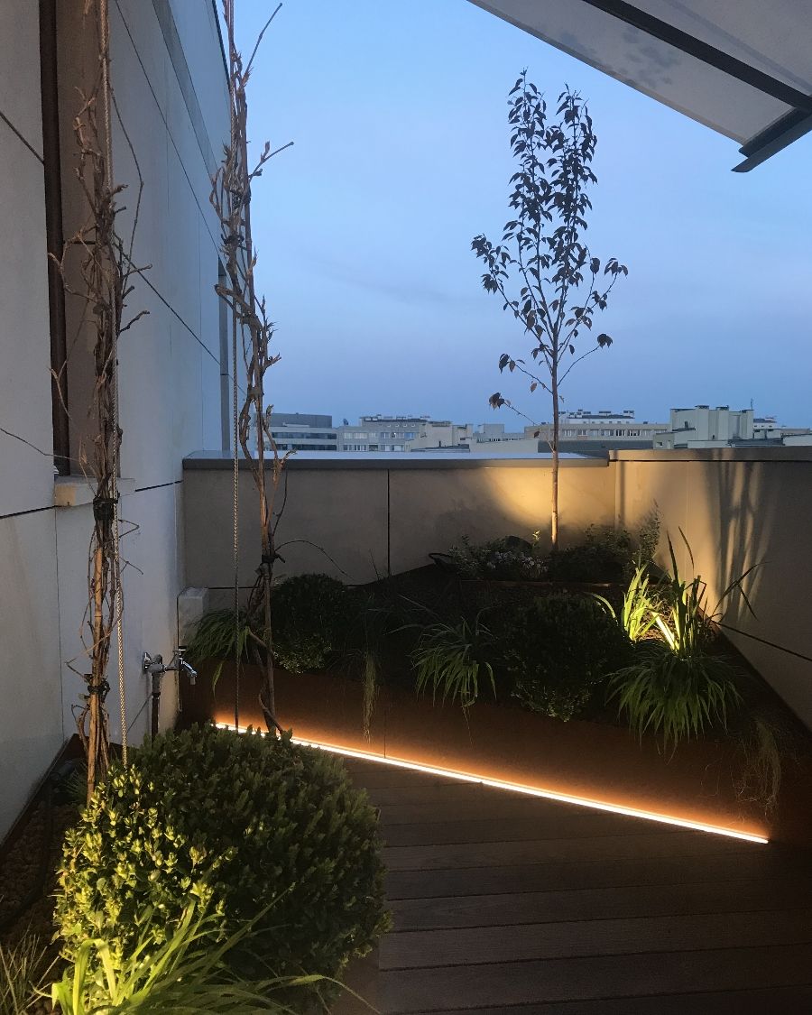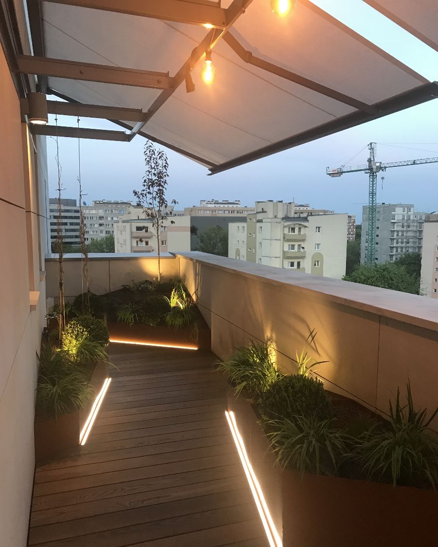 Pomimo swojego kształtu, balkon udało podzielić się na dwie strefy – wypoczynkową i jadalnianą. Metalowe donice, ze względu na swój nietypowy kształt i kolor, zostały wykonane na zamówienie i obsadzone m.in. turzycami, trawami ozdobnymi, irysami i bukszpanami. Ważną rolę odgrywa tutaj oświetlenie poziome, które podkreśla linię donic i dodaje całości nowoczesnego sznytu. Thermo jesion, którym wyłożona została podłoga, to trwały i naturalny materiał . Jego wyraźne usłojenie oraz ciepły kolor optycznie „zmiękczają“ całość, jednocześnie kontrastując z gładką powierzchnią metalowych donic.