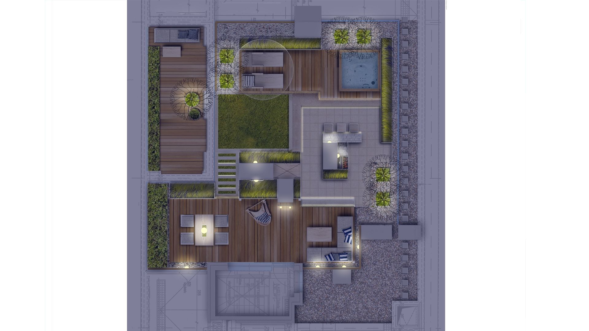 Ogród na dachu o nowoczesnym charakterze, z wydzielonymi strefami: jadalnianą, wypoczynkową, kuchenno-barową i strefą z Jacuzzi. Proponowane materiały wykończeniowe o jasnych kolorach i ciepłej tonacji stanowią doskonałe tło dla soczystej zieleni roślin.