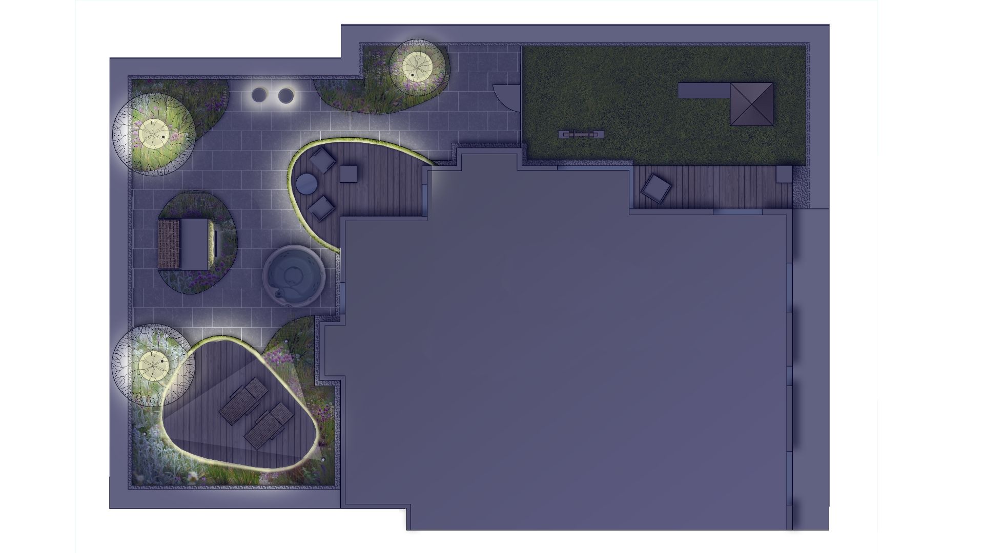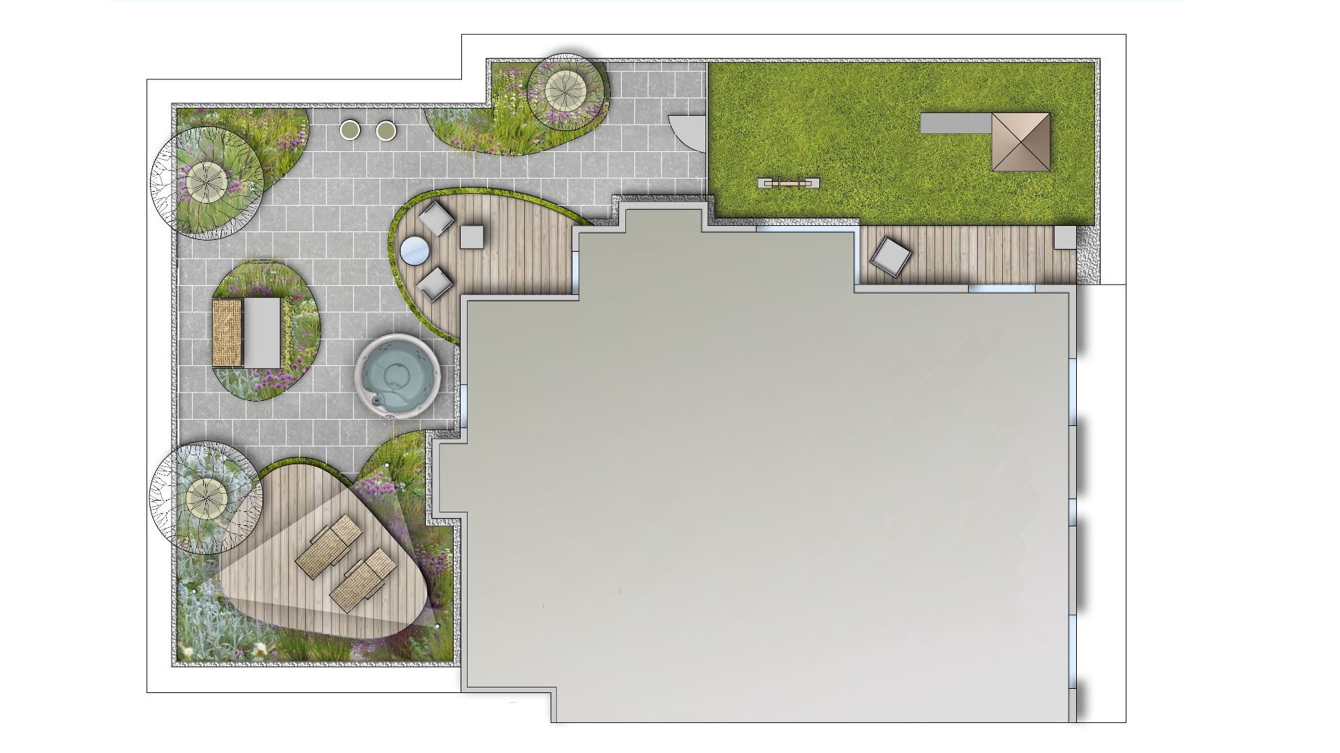 Ogród na dachu o organicznym układzie rabat z okalającymi je powierzchniami pokrytymi kamieniem i drewnem. Roślinność o naturalistycznym charakterze spełnia jednocześnie funkcję parawanu. W przestrzeni ogrodu wydzielona została strefa zabaw dla dzieci.
