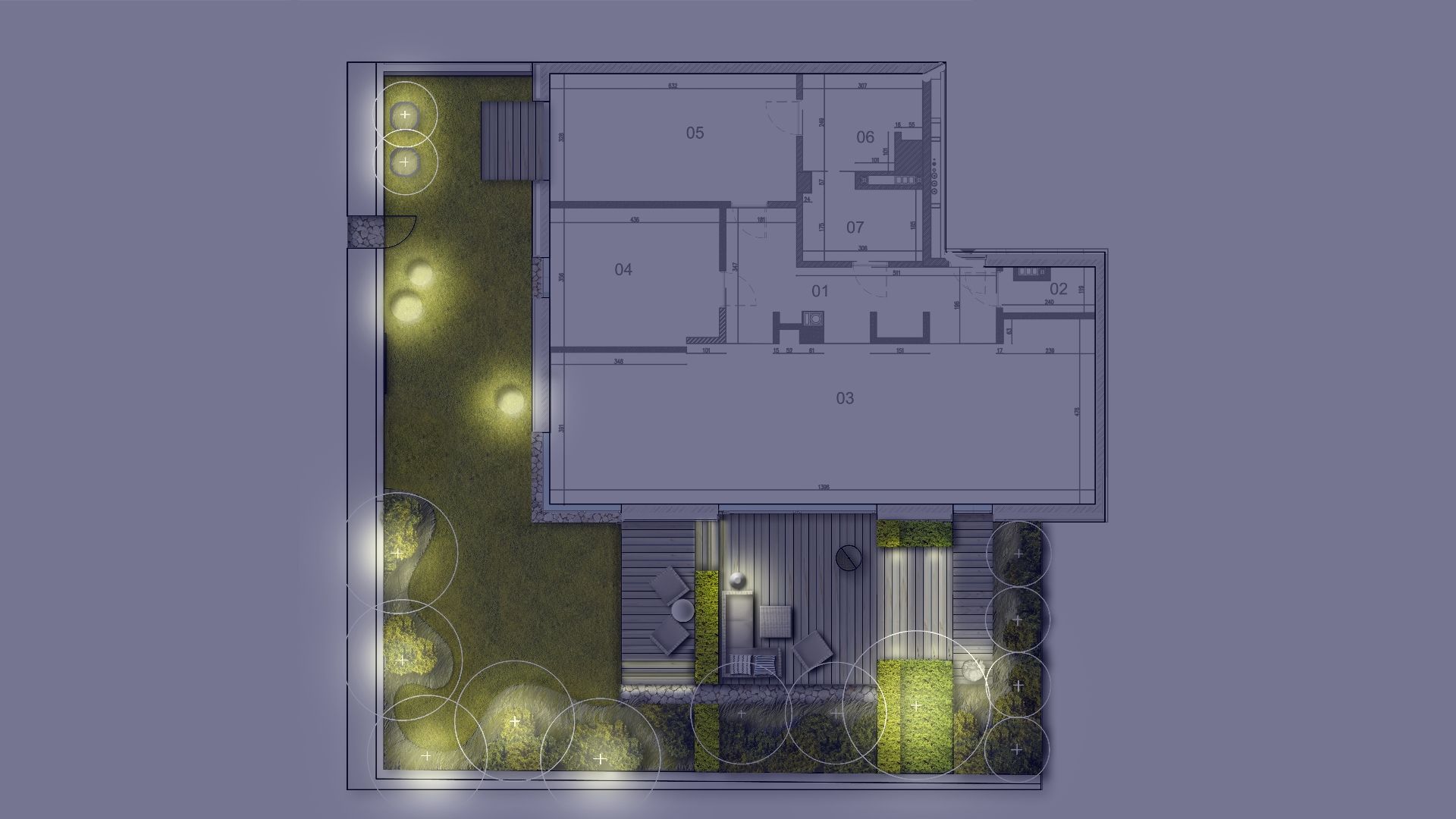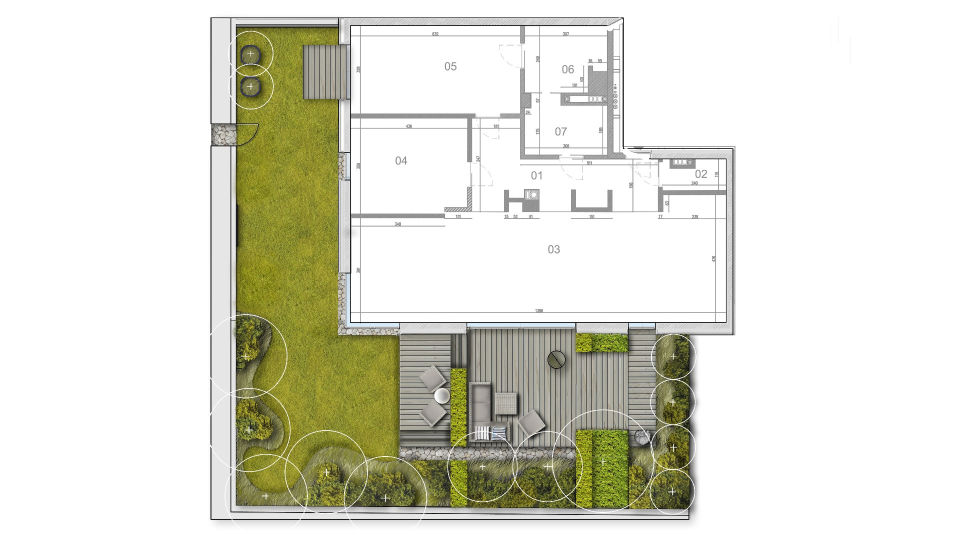 Głównym założeniem projektowym było optyczne powiększenie mieszkania. Duży taras z powcinana w niego roślinnością, otoczony wysokimi, naturalistycznymi nasadzeniami pozwala na swobodne korzystanie z ogrodu. Układ desek tarasowych  różnicuje i zaznacza poszczególne jego strefy.
